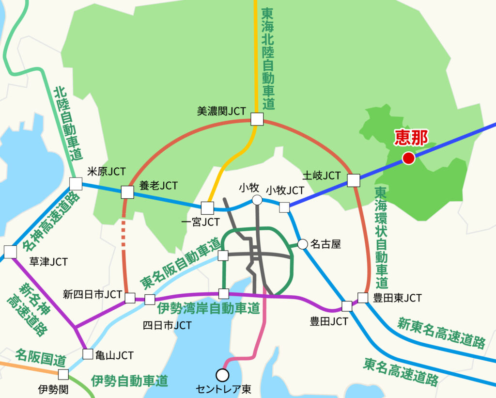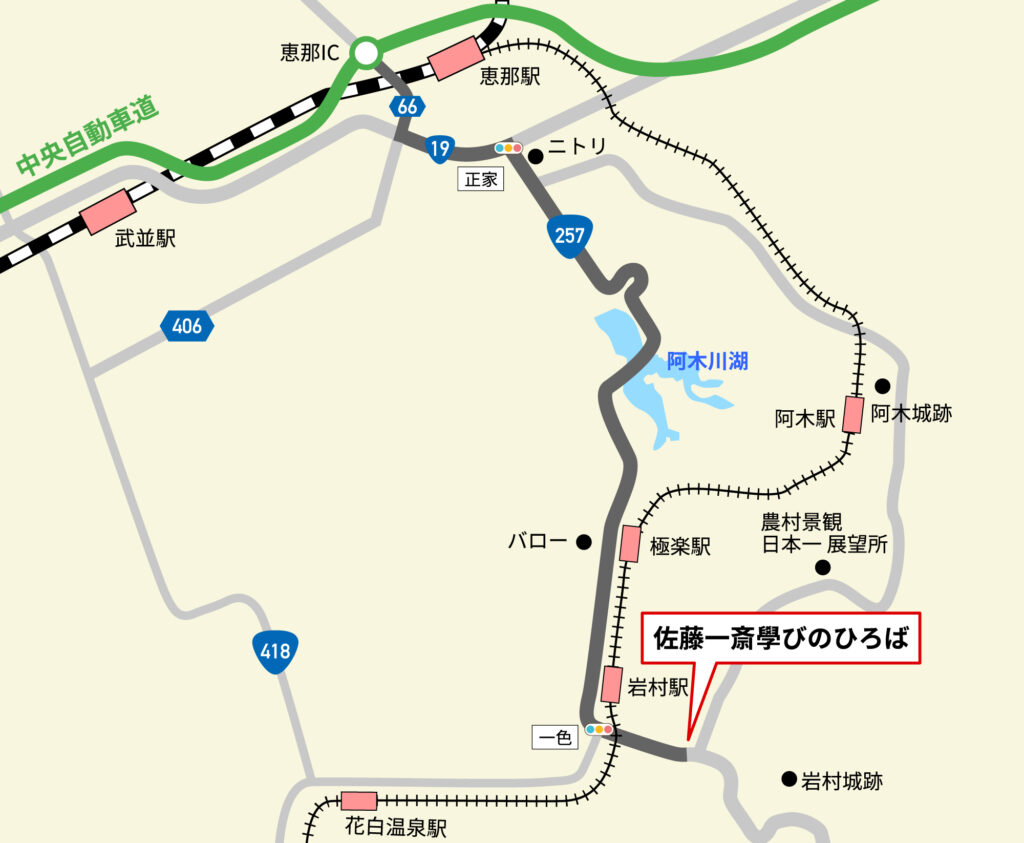 - 恵那IC料金所出口を直進、「恵那IC」交差点を右折。