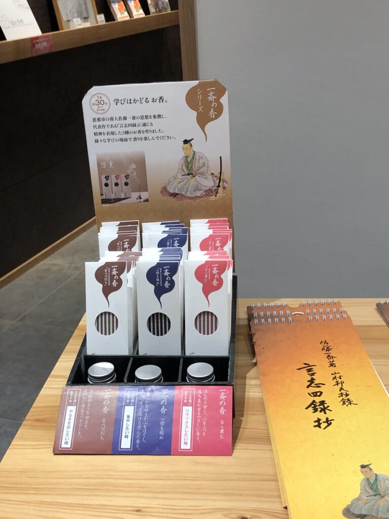 恵那市のデザイン事務所「ゼロワンカンパニー」さんと一緒に作ったこのお香、ブランド名は「想薫(SOU KUN)」といいます。 佐藤一斎先生の教えや、岩村の風景をイメージして作られた、ここでしか買えない特別な香りです。《1個600円(税別)》