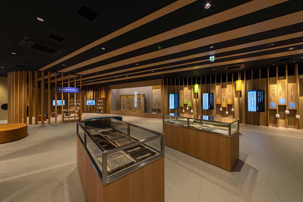 壁面の大型展示ケースには、佐藤一斎直筆の屏風や掛け軸を展示。平面の展示ケースには、儒教の経典『四書五経』を展示。約200年前の貴重な現物を目の前で見ることで、佐藤一斎が活躍した江戸時代からの時の流れを感じることができます。